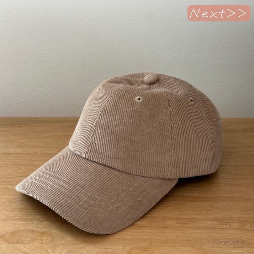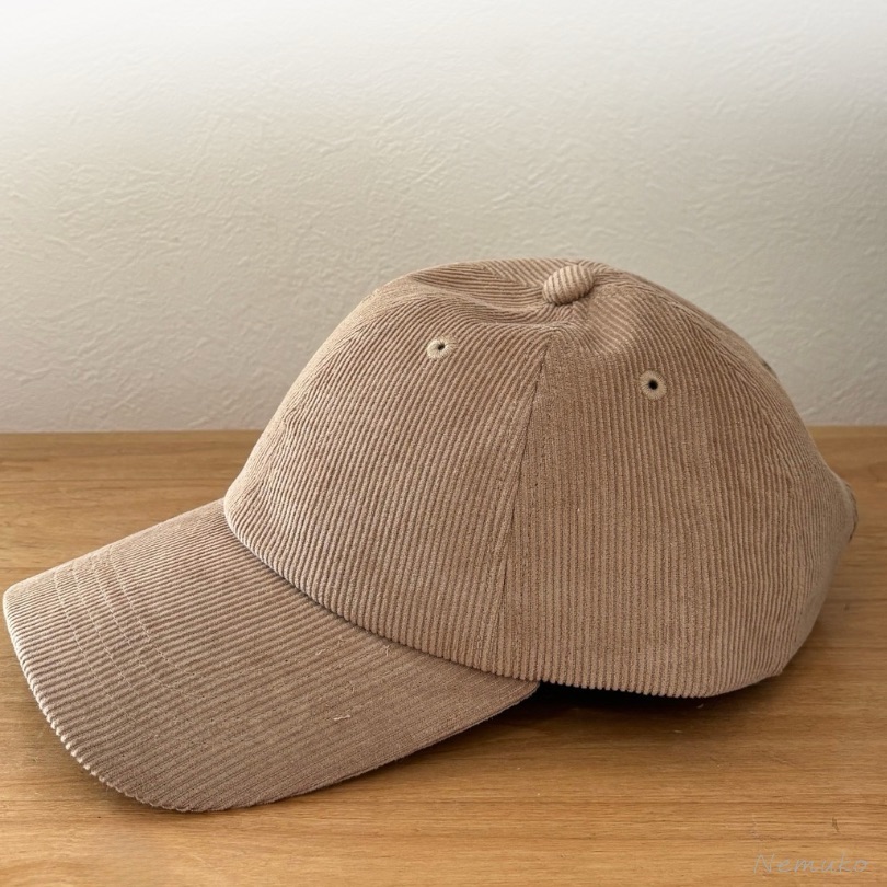 一つ目はコーデュロイ素材のキャップです。ベージュを選びました。