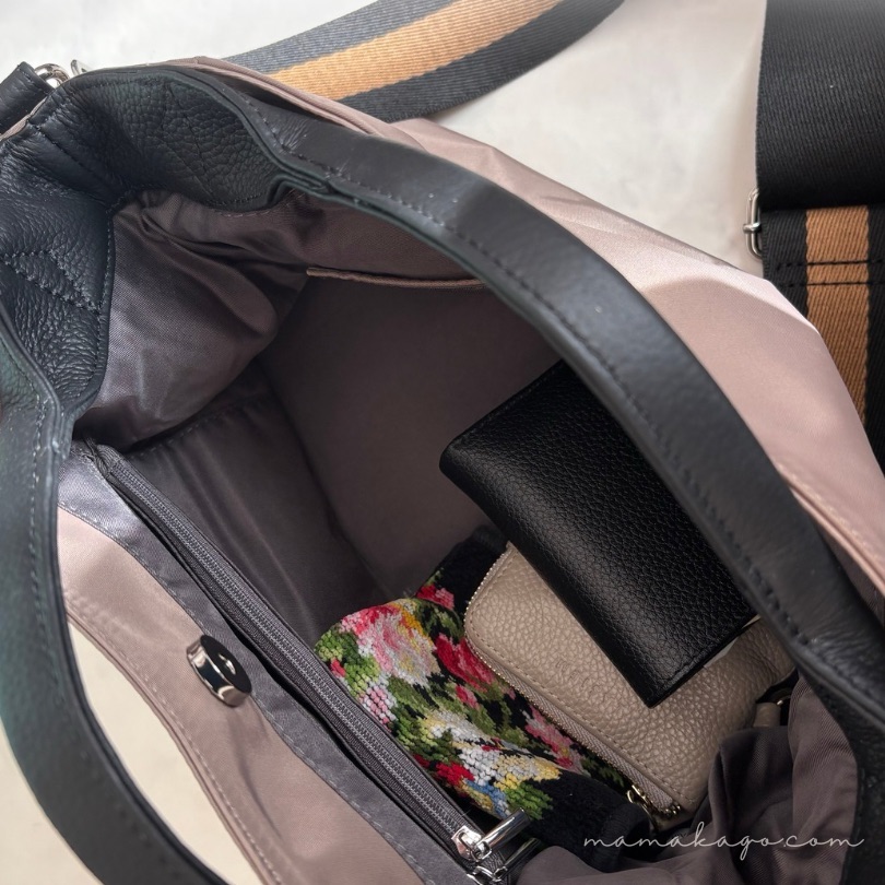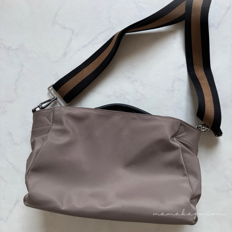 こちらはナイロン素材で軽量ですが本革ハンドルがついていることによってカジュアルになりすぎず上品な感じが気に入っています。